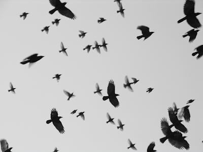 Martin looked up from his laptop when he heard a swoosh of cloth unfurling. Nadine was dropping white fabric, rolled up like window blinds, from the ceiling to create a sort of box around the audience, the man and the woman facing the projection wall. She rushed over to adjust the amplifier under the reception desk and tip-toed back to the screening area. Patting all the pockets of her coveralls, she found a remote control and straightened her arm in the direction of the projector. Crows filled the white wall of the Black Dot Museum of Political Art. Fifty or 60 crows against a grey sky, sequenced in soft superimposition, one shot to the next, all taken within seconds of each other from a static position.