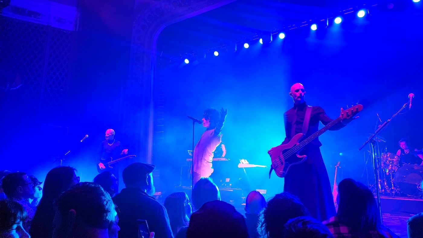 So, at present then, Numan—looking like Yungblud’s dad with his thickly spiky, tousled mane, racoon eye makeup and what appears to be a straitjacket turned into a matching, two-piece tunic/slacks set—is akin to a walking, writhing, thrashing, undulating id as he paced/stalked across the stage of Glenside’s Keswick Theatre. Along with Numan’s tonsorial/sartorial demeanor—so much for the halting robot alien guy he acted as at his start—and a deeply saturated-color light show, his now-deeper voice growled/crooned its way through the mournfully souped-up sounds of “Halo,” “A Prayer For The Unknown” and “Haunted.”